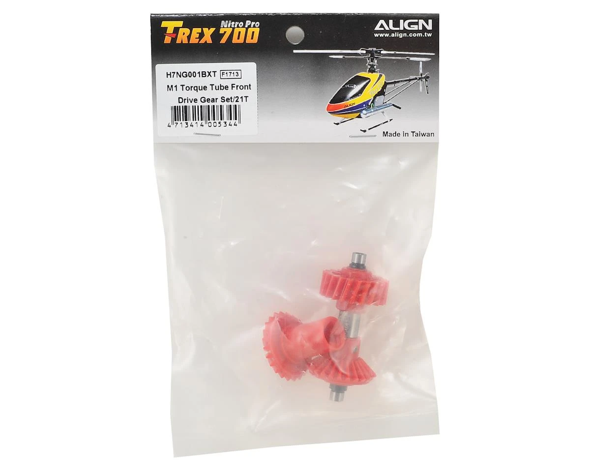 This is an optional Align 21 Tooth, M1 Torque Tube Front Drive Gear Set, and is intended for use with the Align T-REX 700N nitro helicopter. This gear set utilizes updated highest spec and superior anti-wear material to increase the overall strength and durability for torque tube drive gears. This material effectively minimizes gear striping and crash damage.