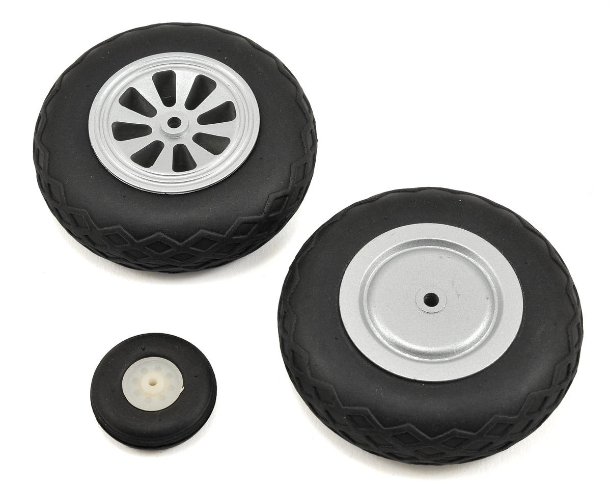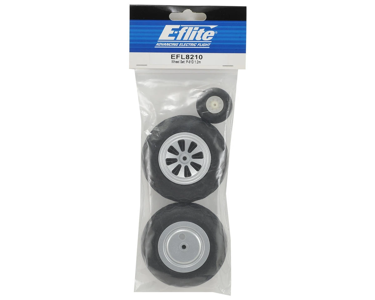 E-flite P-51D Mustang 1.2m Wheel Set. Package includes main landing gear wheels and tail landing gear wheel.