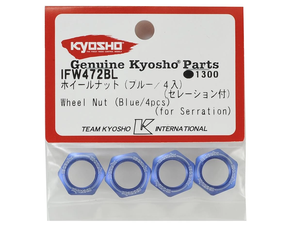 This is a pack of four optional Kyosho 17mm 1/8 Serrated Wheel Nuts in Blue anodize.