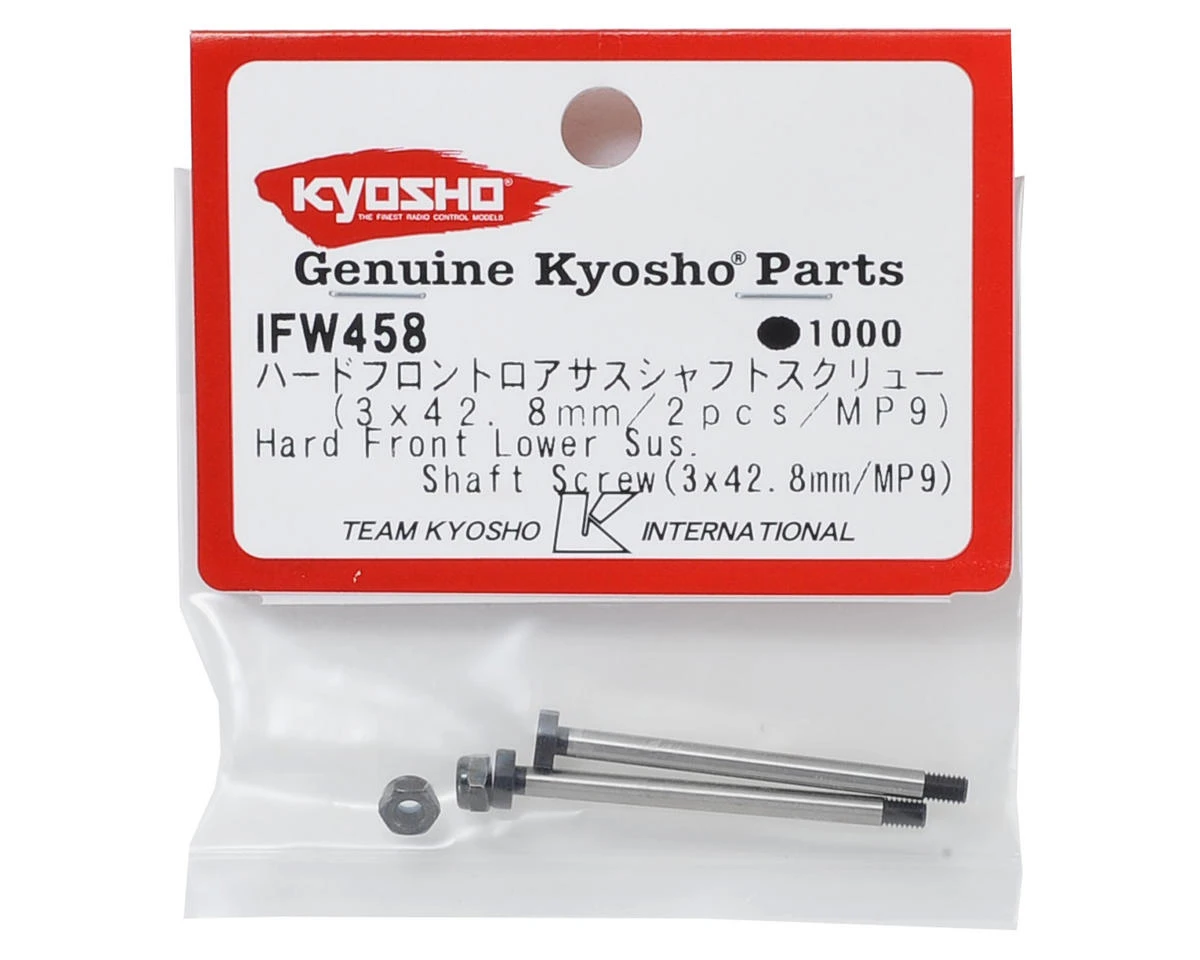 This is a pack of two optional Kyosho 3×42.8mm Hard Front Lower Suspension Shaft Screws. These hinge pins are required for use with the optional Hard Front Suspension Arms (KYOIF483).