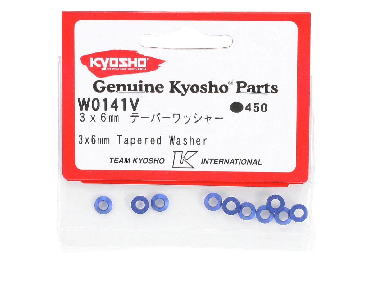 This is a set of ten replacement 3x6mm blue aluminum tapered washers for Kyosho buggies, and fits the Inferno MP7.5 and Inferno MP777 family of buggies. These are the small tapered washers that are used on the bottom of the steering ackerman plate to attach the steering linkages between the steering ackerman plate and the steering knuckles.