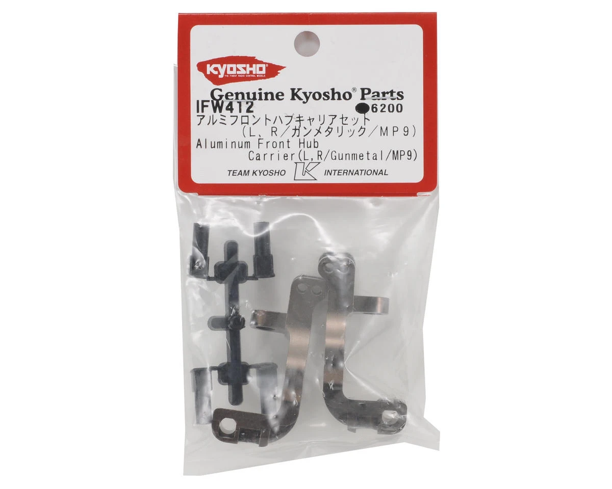 This is an optional Kyosho Aluminum Front Hub Set, and is intended for use with the Inferno MP9. These upgrade parts are direct replacements for the stock plastic front hub carrier. CNC Machined from 7075 aluminum and Hard Anodized in Kyosho’s unique gunmetal finish, these hubs add not only a cool factory look, but also strength, rigidity and reliability to the MP9 and MP9e platforms. Includes the caster inserts that allow for -1°, 0° and +1° caster adjustments.