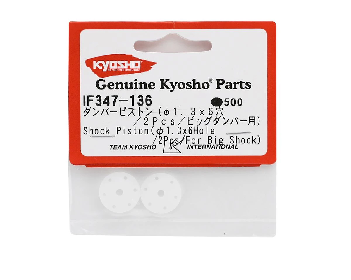 This is a set of two replacement 1.3mm 6-hole shock pistions for the Kyosho big bore shocks and fit the Inferno MP777 family of buggies.