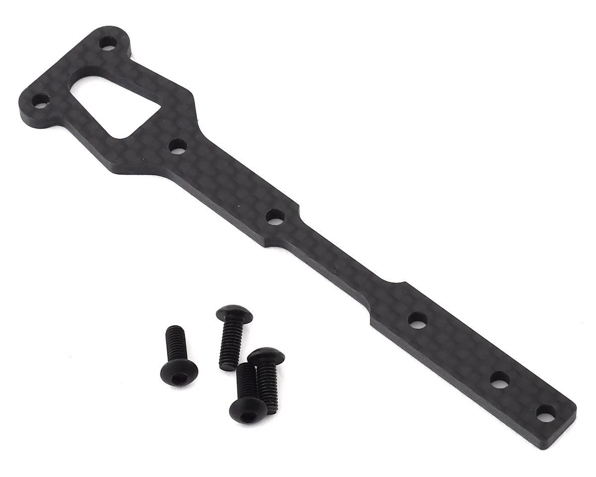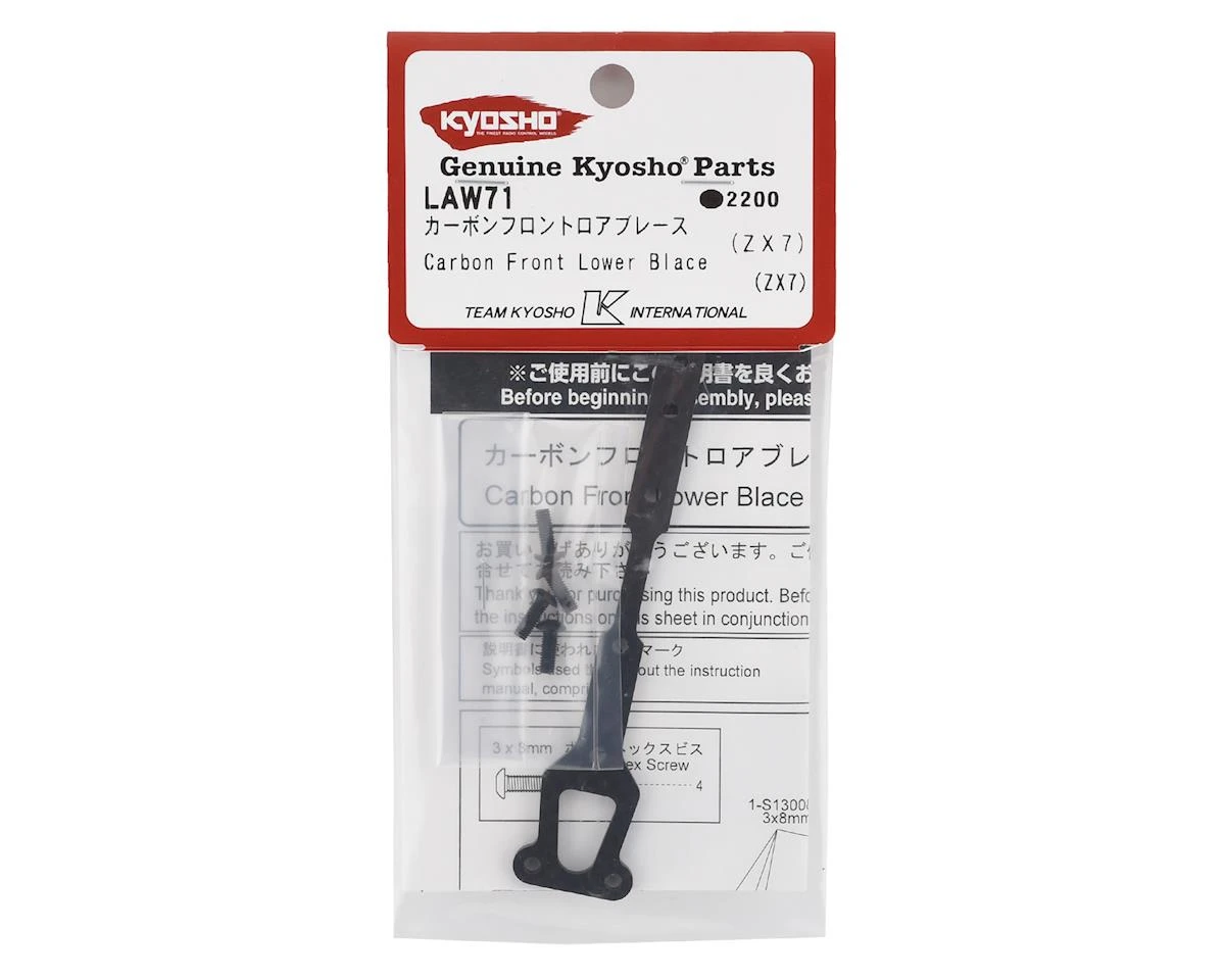 This is an optional Kyosho Carbon Front Lower Brace for the ZX7 4WD Buggy. This brace attaches to the chassis spline for increased chassis stiffness. Recommended for high grip applications.Â