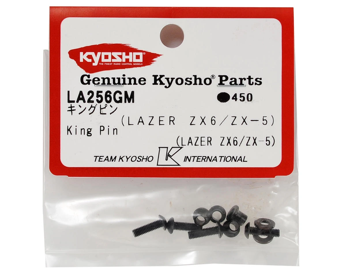 This is a replacement Kyosho King Pin Set. Package includes four king pin screws, four top hat washers and two shims. These fit the Lazer ZX-5 SP through FS2 SP, as well as the Ultima RB/RT/SC6 family of vehicles.