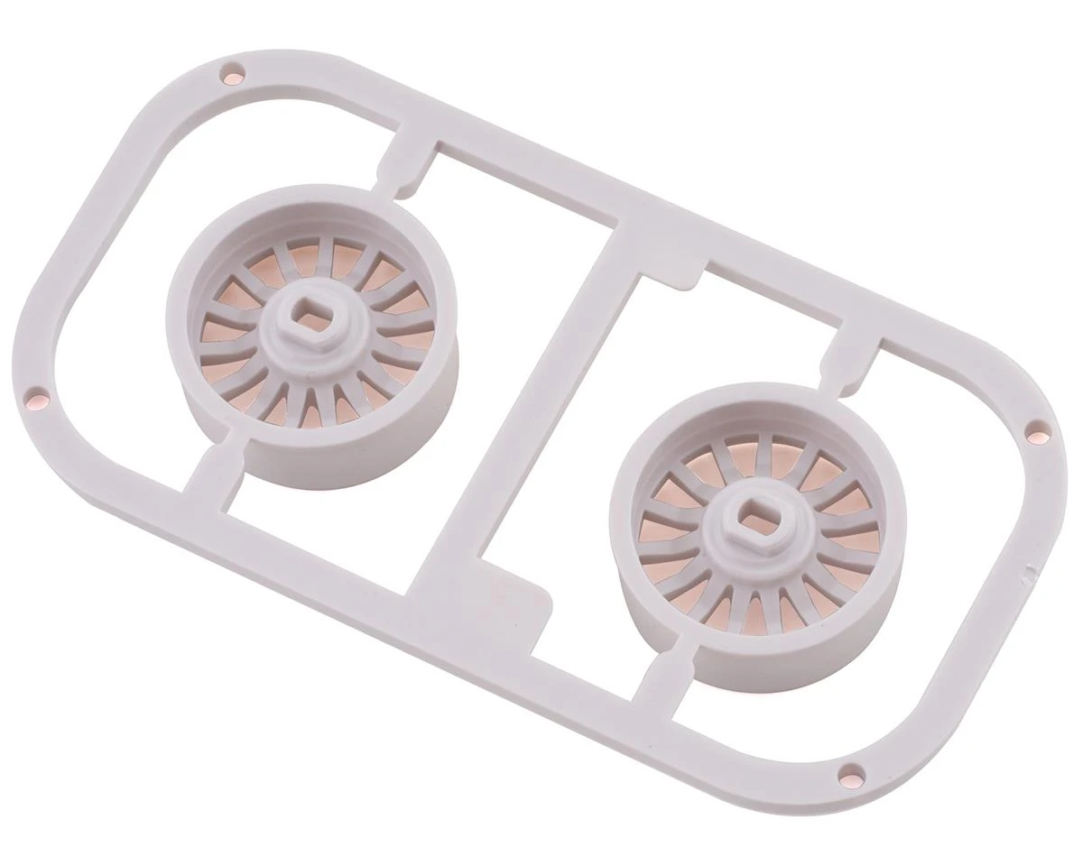 This is a optional set of two Kyosho Mini-Z AWD Multi Wheels. These are the optional Narrow, +1.5 Offset AWD Wheels, and are a great option for tuning Mini-Z AWD models for improved handling, or to suit different bodies. Plus, the bright white plastic is perfect for adding a personalized touch with your prefered color paint.Â