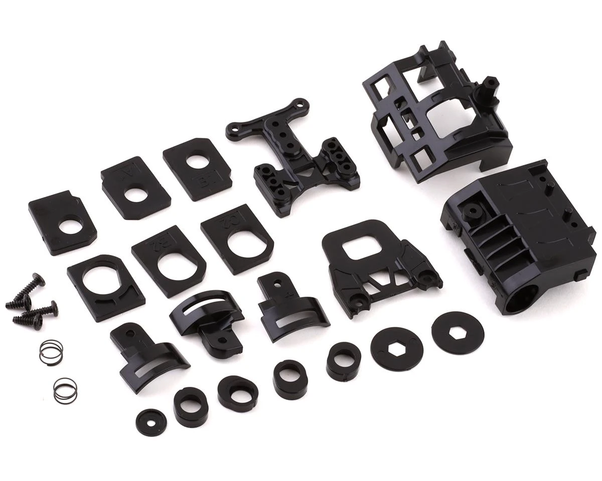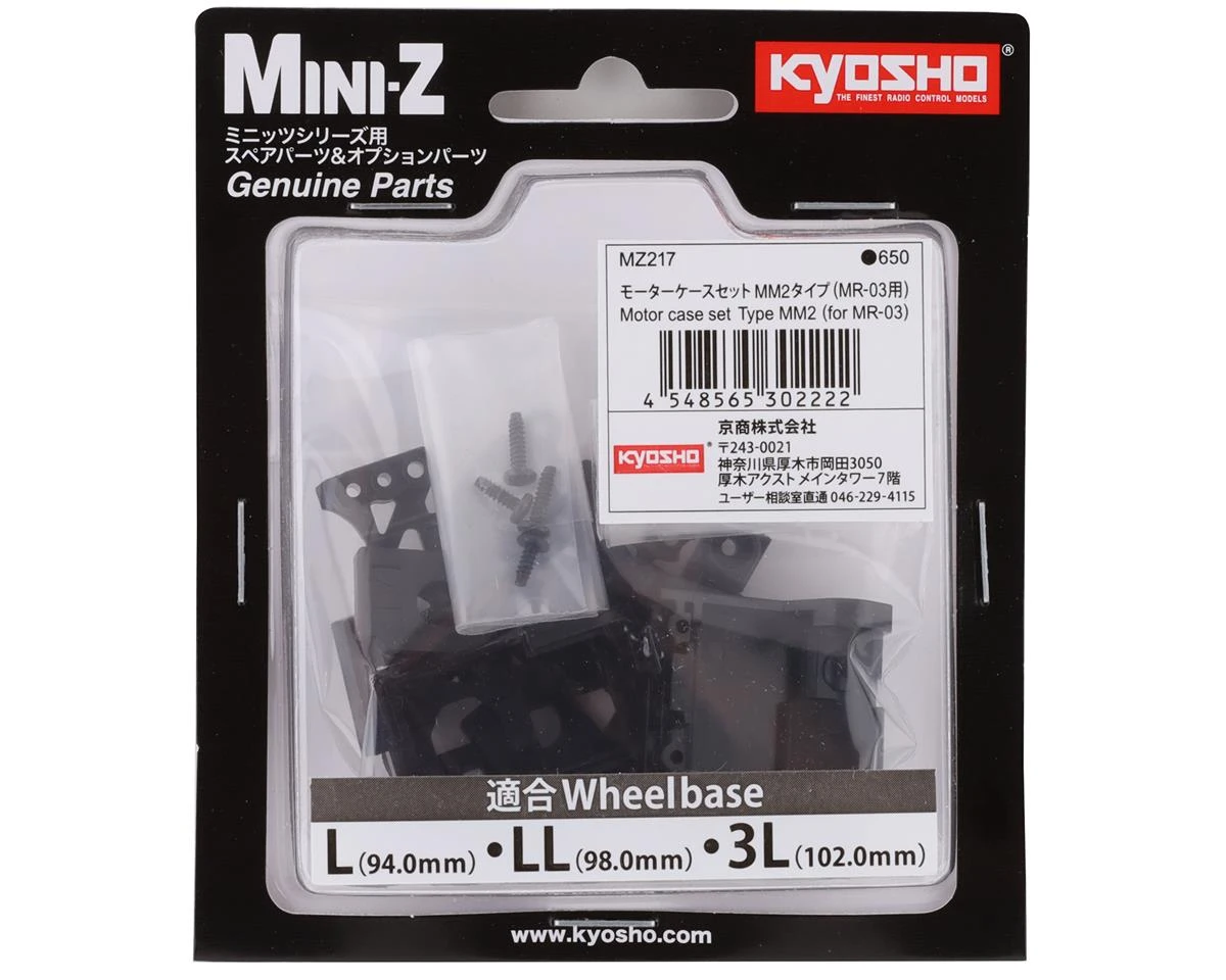 Kyosho Mini-Z MR-03 MM 2 Type Motor Case Set. Package includes replacement MM 2 type motor case components that allows adjustable axle height, and friction shock.Â