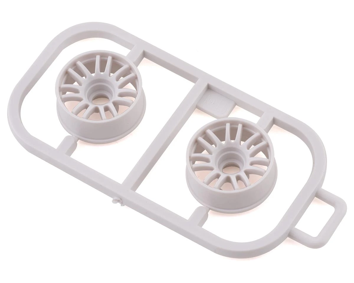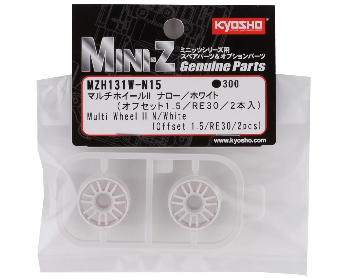 This is a optional set of two Kyosho Mini-Z Rays RE30 Multi Wheel II. These are the optional Narrow, +1.5 Offset Wheels, and are a great option for tuning Mini-Z models for improved handling, or to suit different bodies. Plus, the bright white plastic is perfect for adding a personalized touch with your preferred color paint.Â