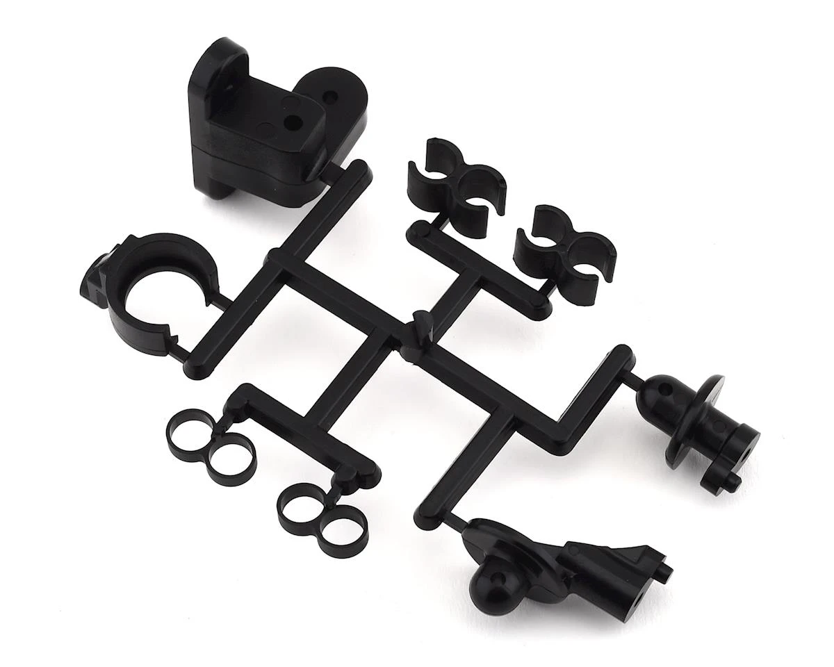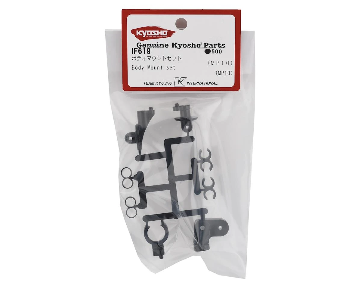 This is a replacement Kyosho MP10 Body Mount Set. This set includes the front and rear body mounts, fuel line clips, fuel filter holder and rear chassis brace support piece.