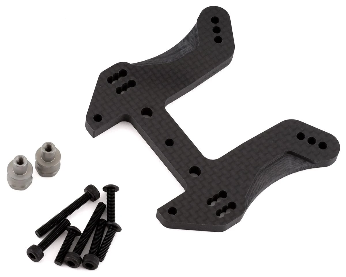 Kyosho MP10 Carbon Long Front Shock Tower. This optional shock tower is intended for the Kyosho MP10 equipped with long shocks. The lightweight construction allows for a lower CG and slightly more flex than the aluminum shocks. This added flex provides a different feel that can aid setup on various tracks. Package includes one shock tower, two standoffs and hardware.Â
