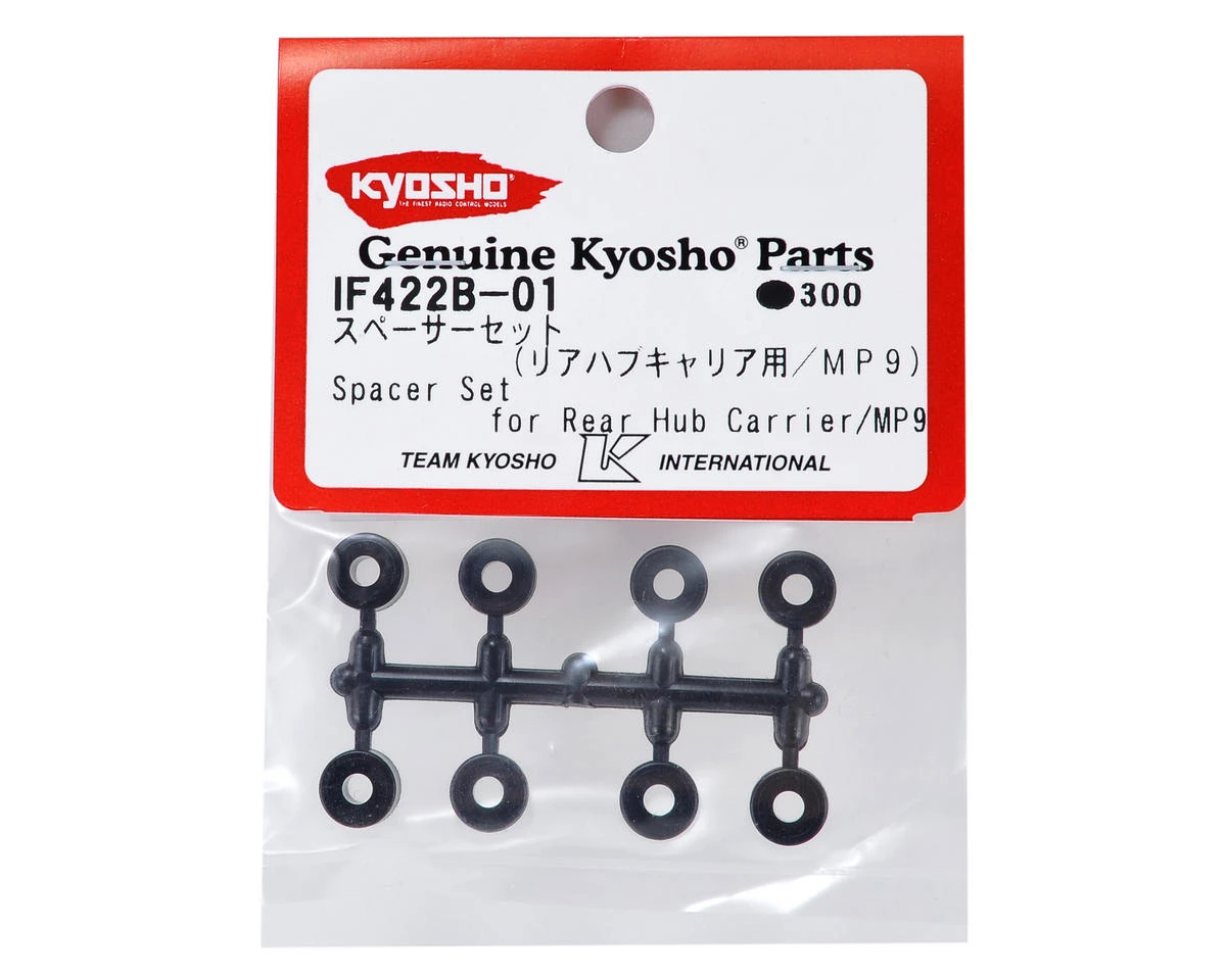 This is a replacement Kyosho MP9 Rear Hub Carrier Spacer Set. These spacers are used to adjust the wheelbase and the spacing of the rear hubs. This helps to tune the rear traction by altering the amount of rear overhang, resulting in more or less weight transfer to the rear wheels under acceleration depending on the placement of the spacers. Package includes two 5mm spacers, four 2mm spacers and two 1mm spacers.