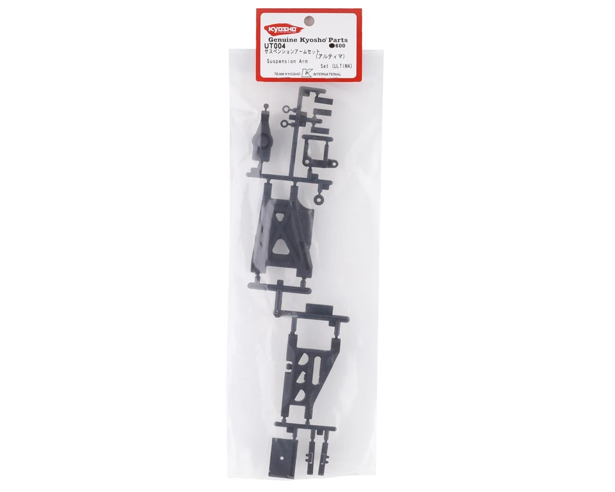 Kyosho Ultima Suspension Arm Set. These replacement suspension arms are intended for the Kyosho Ultima. Package includes one front suspension arm, one rear suspension arm, one C-block, one rear hub and inserts that can be used on the right or left side of the chassis.