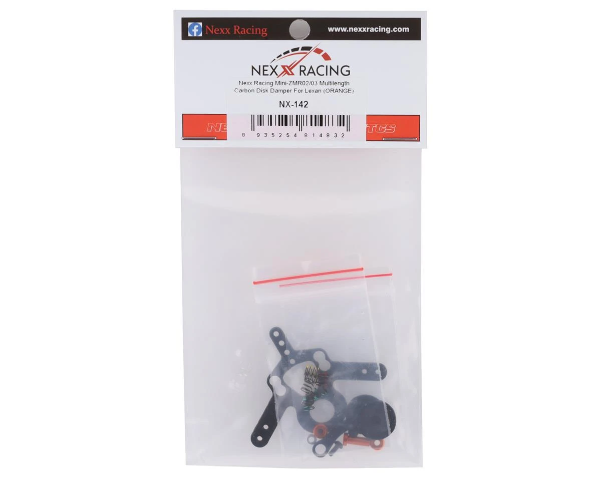 An optional upgraded NEXX Racing Multilength Carbon Disk Damper kit for use with various Lexan bodies when installed on the Mini-Z MR-02 and MR-03 vehicles. The included springs are offered for tuning adjustments, thanks to their different stiffness.Â