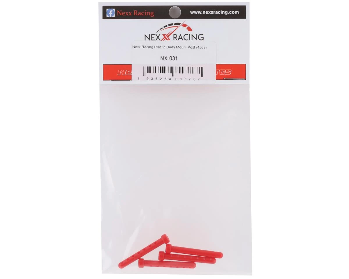 A replacement package of four NEXX Racing Plastic Body Mount Posts. Intended for replacement posts from all NEXX Lexan Body Mount Upgrade Kits for Mini-Z family of vehicles.