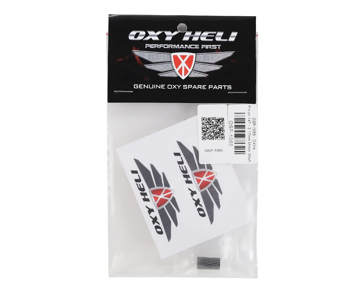 This is an Oxy Heli 14T Pinion for a motor shaft of 3.17mm, suited for use with the Oxy 4 heli.Â