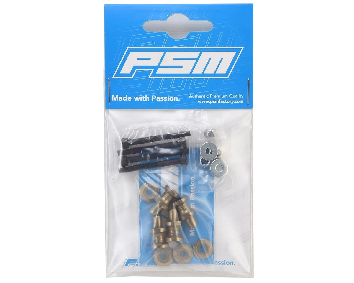 These aluminum shock standoffs are designed for lightweight shock fastening and will work with Kyosho MP9 TKI4. The special design features the flat-width moved to the center of the standoff to provide easier access for tightening. For the smoothest shock travel possible, it is recommended to use the PSM shock bushing set with these standoffs!