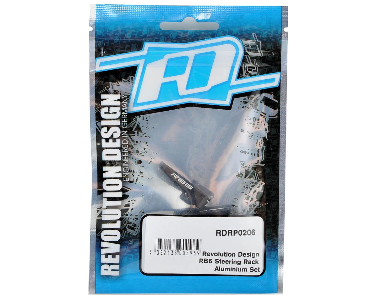 This is an optional Revolution Design Racing Products Aluminum RB6 Steering Rack Set. The Revolution Design Racing Products aluminum steering rack set replaces the stock plastic steering bell cranks and rack with a rigid and precise solution. All parts are CNC-machined from aircraft-quality 7075-T6 aluminum to maximize durability, while the black anodizing and laser etching deliver a stealthy factory look. The higher strength of the bellcranks and rack also improves steering precision on high-grip surfaces for improved agility and predictable handling. Package includes two bell cranks and the steering rack.